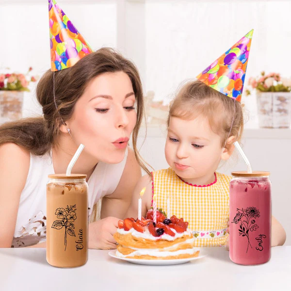 Celebrate your loved ones with our Personalized Name Can Glass featuring their birth flower. This custom can glass comes with a straw and makes a perfect gift for mothers, friends, family members, and bridesmaids. Add a personal touch to any occasion with this unique and thoughtful present.