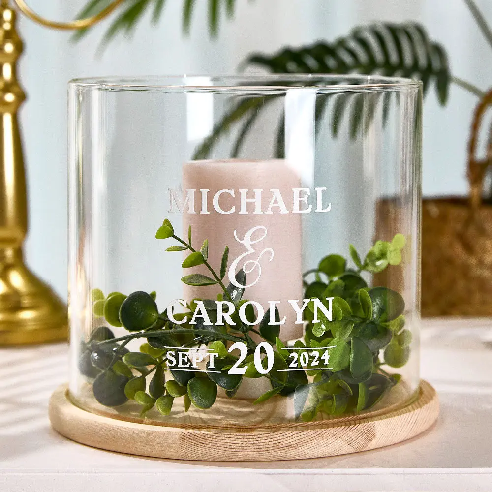 This personalized wedding hurricane with wood base candle holder is a unique and meaningful decoration for any wedding event. Crafted with high-quality materials, it offers a touch of elegance and personalization to any wedding decor. Plus, it serves as a beautiful keepsake or gift for the newlyweds to cherish for years to come.