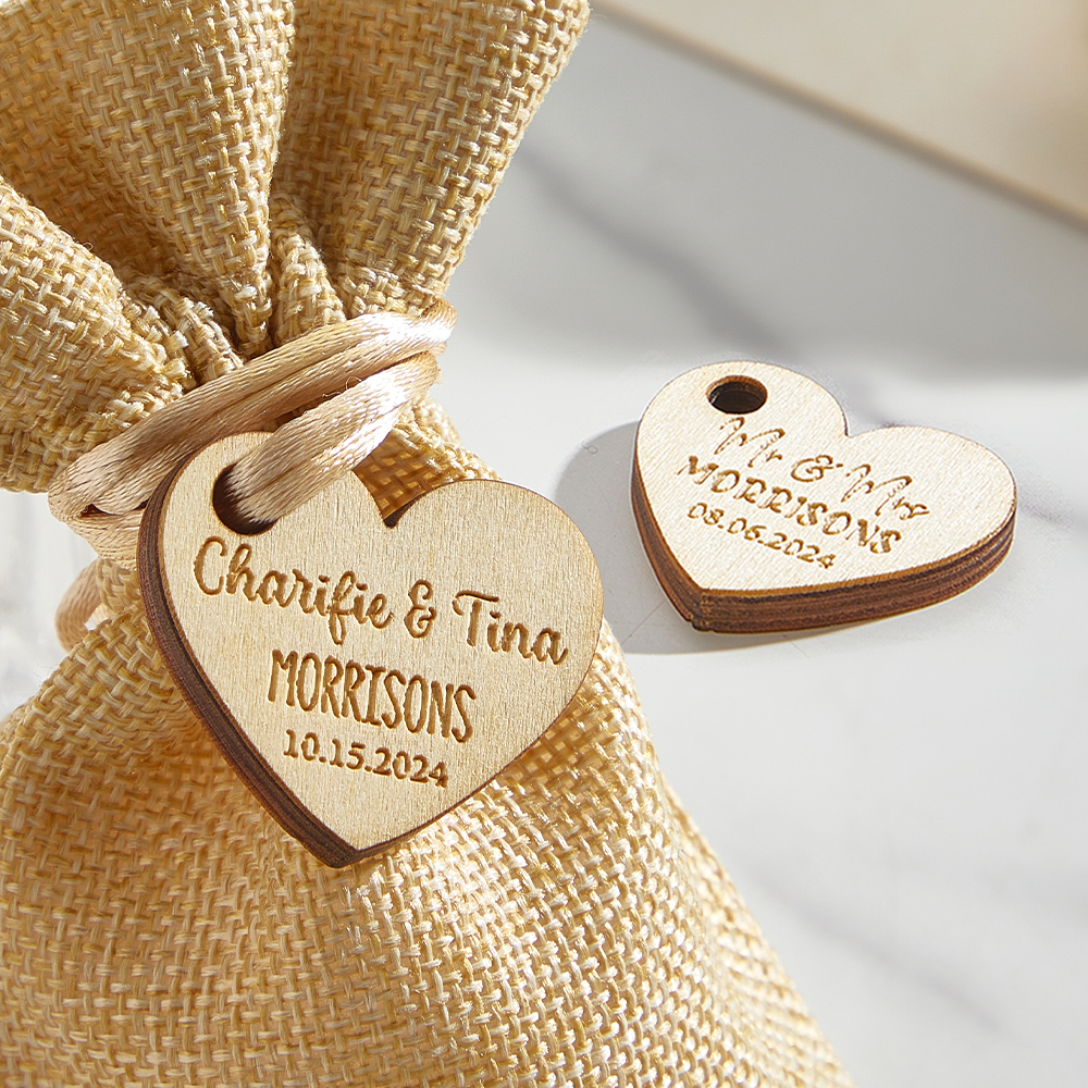 Crafted from high-quality wood, these personalized heart tags with engraved text make the perfect wedding party favor for your guests. Customize each tag with a unique message, adding a personal touch to your special day. Show your appreciation with these thoughtful and elegant gifts, sure to be cherished by all.